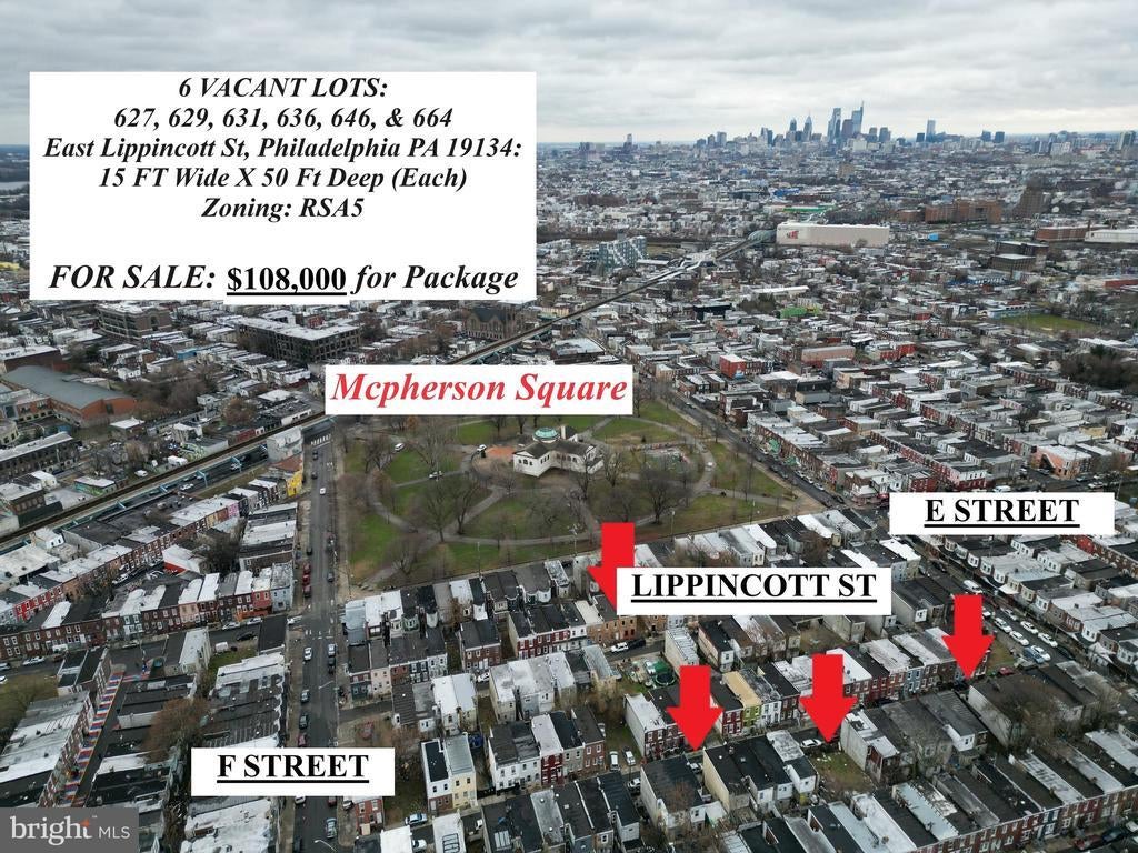 6 Lot Package on 600 Block of East Lippincott in Kensington 627 Easy Lippincott St, Philadelphia PA 19134 (15 FTX50FT) RSA5 ZONING 629 Easy Lippincott St, Philadelphia PA 19134 (15 FTX50FT) RSA5 ZONING 631 Easy Lippincott St, Philadelphia PA 19134 (15 FTX50FT) RSA5 ZONING 636 Easy Lippincott St, Philadelphia PA 19134 (15 FTX50FT) RSA5 ZONING 646 Easy Lippincott St, Philadelphia PA 19134 (15 FTX50FT) RSA5 ZONING 664 Easy Lippincott St, Philadelphia PA 19134 (15 FTX50FT) RSA5 ZONING All lots on the same block - between E Street & F Street off of Allegheny Avenue in the heart of Kensington. Right by K&A. Development will be coming this way soon. This is a good buy & hold opportunity to get your hands on 6 building sites on the same block. Easy access to the El, McPherson Square, Kensington Ave, & Allegheny Ave. Any builder, or aggregator of land understands the added value of having parcels together on the same block. 6 Parcels together ultimately will reduce your building costs and efficiency - acquire the land now before the prices increase. Asking Price: $108,000 (MUST BUY ALL)